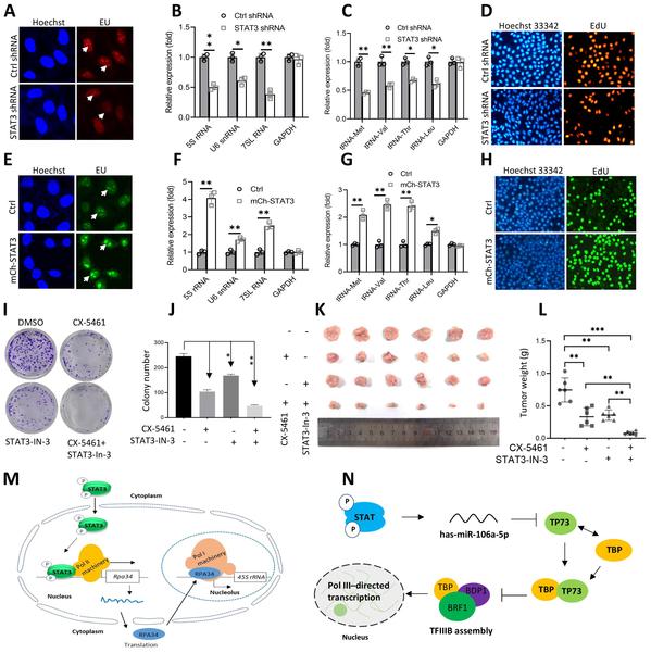 图1. STAT3调节Pol I和 Pol III指导的基因转录和癌细胞增殖。A) HepG2细胞EU染色结果显示STAT3沉默减少核仁中rRNA的表达;B,C)RT-qPCR结果显示STAT3沉默降低Pol III 产物的表达;D) EdU结果显示STAT3沉默抑制HepG2细胞增殖。E) HepG2细胞EU染色结果表明STAT3过表达增加核仁中rRNA的表达;F,G)RT-qPCR结果显示STAT3过表达促进Pol III 产物的表达。D) EdU结果显示STAT3过表达增加HepG2细胞增殖。I, J) STAT3 抑制剂和Pol I抑制剂对细胞克隆形成的影响。K, L) STAT3抑制剂和Pol I抑制剂对裸鼠成瘤的影响。M) STAT3 调节Pol I 转录的机制模型;N) STAT3调节Pol III 转录的机制模型。*, P<0 .05; **, p<0.01; ***,p<0.001.