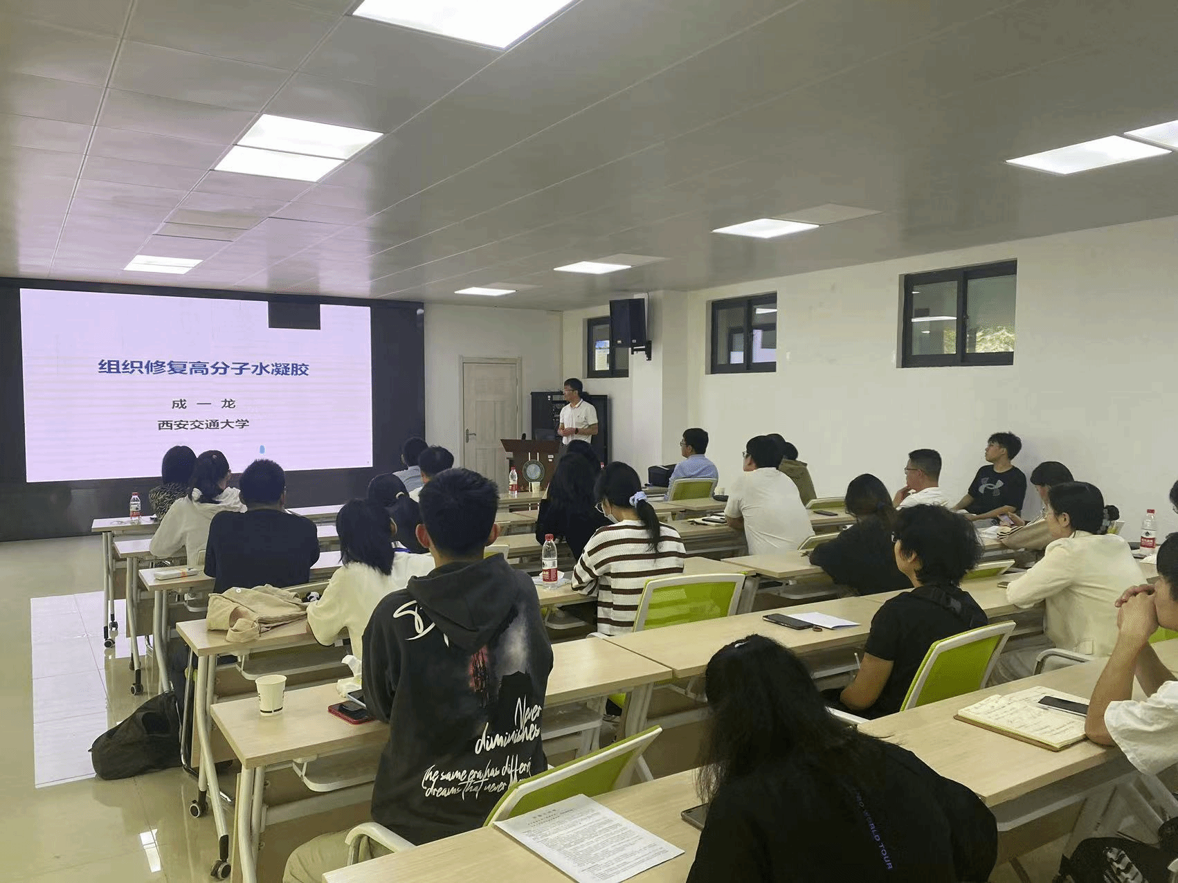 在报告会最后,宋万通研究员、成一龙教授与廖兴华副院长、李钰策老师、邱文秀副教授、徐承晨老师等在场师生就报告内容进行了深入探讨和交流,二位专家教授耐心细致地解答了参会师生提出的问题。本次精彩的学术讲座让参会师生受益匪浅,使师生深入了解了高分子免疫佐剂和水凝胶及其生物医学应用的研究进展,激发了学生的科研热情,为进一步营造校园科研氛围、推动校园学科建设夯实根基。